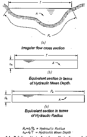 Figure 2-4 shows an irregular flow cross section with different methods for defining depth of flow. In terms of frictional head losses, the perimeter is important. Hydraulic radius, Rh, is defined as the area of the flow section divided by the wetted perimeter, Pw, which is shown on figure 2-4 and is written as: