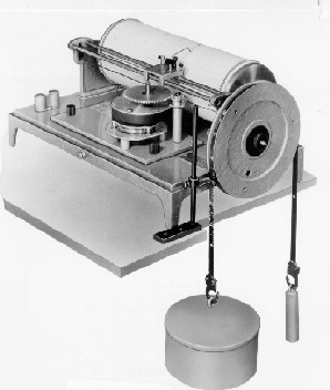 In general, analog or graphical recorders consist of two main elements: a clock mechanism actuated by a spring, weight, or electric motor and a gage height element actuated by a float, cable or tape, and counterweight. Four basic types of recorders use these elements. Figure 6-3 shows a horizontal drum recorder, in which the clock positions the pen along the drum axis, and the gage height element rotates the drum. This recorder is also available with a vertical drum. Another type of recorder also has a vertical drum, but the time and height elements have been reversed so that the clock mechanism rotates the drum.