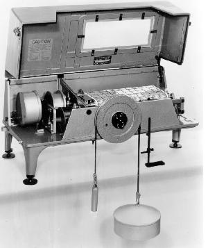 The fourth type of graphic recorder is shown on figures 6-4 and 6-5. The time element, consisting of a compensated, balanced, weight-driven clock, drives two parallel rolls, one of which holds the supply paper. The paper unrolls from the supply roll at a uniform rate and with constant tension and is taken up on the receiving roll. Speed of travel may be adjusted from 0.3 to 9.6 in per day on any standard instrument, and other chart speeds are available on special order. The normal chart length is 75 feet (ft).