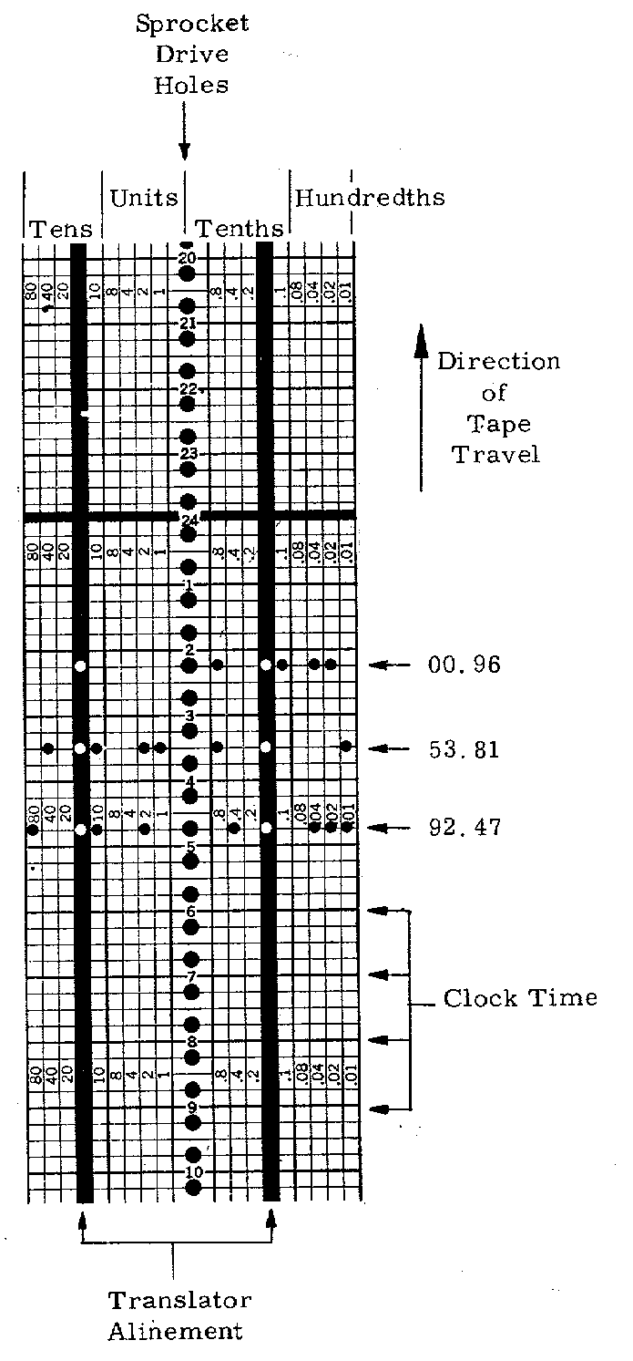 Water stage is transmitted to the punched-paper tape recorder, usually through shaft rotation on a float and pulley arrangement. Shaft rotation is converted by the recorder into coded punch-tape records (figure 6-7). The code consists of four groups of four punches each. In each group, the first punch represents "1"; the second, "2"; the third, "4"; and the fourth, "8." Thus, a combination of 1, 2, or 3 appropriate punches in a given group represents digits from 1 to 9. A blank (no punch) represents zero. Together, the four groups of punches represent all numbers from 0 to 9999.