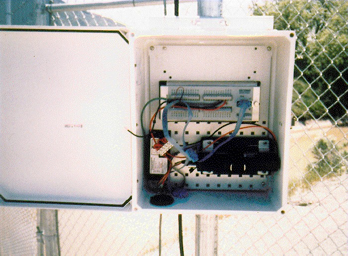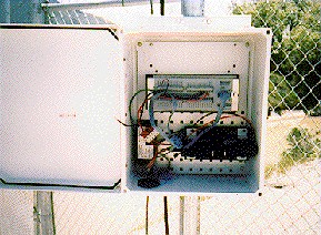 The most recent advances have been in the area of data loggers. This group of electronic instruments has evolved quickly over the last 10 years. Small, battery-operated, fully programmable units offer many features in addition to data recording (figure 6-8). Some type of transducer is required to sense the water stage with this type of recorder. Options range from a pressure transducer sensing water level in a stilling well to a pressure transducer on a bubbler system, to an angular transducer sensing shaft rotation on a float-driven system. In all cases, an analog (voltage or current) output is sensed, digitally recorded, and stored by the data logger. This type of system is perhaps best suited to the transmission of data via satellite or microwave, providing a central control location with current water stage information. Remote sites are very well suited to being powered by batteries which are charged through small solar cells. However, vandalism of the solar panels can be a problem because they must be exposed. Concealing solar panels in some way (such as in the top of a tree) can help.