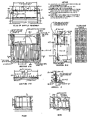 All four designs are arranged to permit easy construction as in-place structures or as precast units. All use reinforced concrete for the main box and headwalls and use separate, easily replaced, wooden or metal baffle assemblies in the weir pool. A space is left open at the upstream face of the baffle so any accumulations of weeds and debris can be removed. Design and construction details for the 5- and 12-ft3/s weir boxes are given in Aisenbrey et al. (1978).