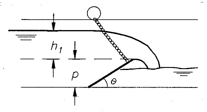 Because h1/p is less than 1.00, and the gate angle is between 16.2 and 63.4 degrees, equation 7-10 can be used to determine that Ca is 1.115. Then, equation 7-9 is used to calculate discharge as below: