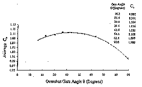 The overfall edge of a leaf gate is in a region of no side contraction; therefore, the effective discharge coefficient can be calculated assuming no side contractions of the weir. Thus, figure 7-5 or equation 7-2 with a C1 of 0.40 and C2 of 3.22 are used to calculate a value for the effective discharge coefficient, Ce, as 3.42 at h1/p of 0.5.