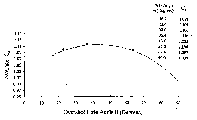 Although water level control is useful, operators also need to know the flow rate at each gate to better operate systems. Wahlin and Replogle (1994) further developed the Kindsvater and Carter (1959) calibration approach for a sloping leaf gate as a weir by modifying equation 7-1 with a gate angle correction coefficient, Ca, as follows: