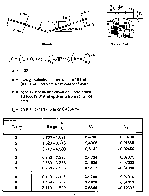 The Soil Conservation Service, now the Natural Resources Conservation Service, (Brakensiek et al., 1979) (U.S. Department of Agriculture, 1962) developed a triangular short-crested weir (referred to by some investigaters as a triangular broad-crested weir) in the 1930's. The short-crested triangular design was adopted to provide a precalibrated meter installation that is economical, durable, and accurate over a wide flow range. The weirs are typically constructed entirely of reinforced concrete. The standard dimensions of the weir crest are given on figure 7-17. Triangular weirs with crest slopes of 2 to 1, 3 to 1, and 5 to 1 are standard. A concrete apron is recommended downstream from the weir for a distance of two measuring heads to prevent erosion. Water stage is measured relative to the weir Vnotch at a location 10 ft upstream from the centerline of the crest profile. The U.S. Natural Resources Conservation Service recommends the channel upstream from the weir be nearly straight and level for 50 ft. The weir notch must be located a minimum of 0.5 ft above the upstream channel bed. Deposition of material immediately upstream from the notch will cause flow measurement inaccuracies that are greatest at low measuring heads. The side slope of the triangular weir should be selected based on natural streambank topography. The weir must provide sufficient upstream ponding such that velocity head at the stage measurement station can be neglected for the desired accuracy. The discharge equation for a short-crested triangular weir is given on figure 7-17.