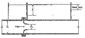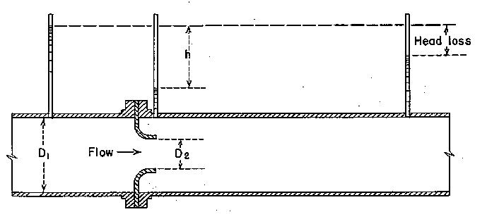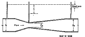 This class of flowmeters includes venturi, nozzle, and orifice meters. When properly installed and used, these meters have a potential accuracy of "1 percent. These meters have no moving parts but use the principle of accelerating flow by some form of constriction. Heads are measured upstream where the meter is the size of the approach pipe and downstream where the area is reduced to a minimum. The basic energy balance relationship is written as discussed in chapter 2. The velocity at one of these locations is solved for in terms of the difference of head between the two locations. Using the product of the upstream velocity and area results in discharge expressed as: