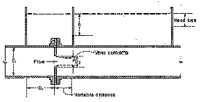 In effect, the flow nozzle is a venturi meter that has been simplified and shortened by eliminating the gradual downstream expansion (figure 14-3). The streamlined entrance of the nozzle causes a straight jet without contraction, so its effective discharge coefficient is nearly the same as the venturi meter. Flow nozzles allow the jet to expand of its own accord. This feature causes a greater amount of turbulent expansion head loss than the loss that occurs in venturi meters, which suppress exit turbulence with a gradually expanding tube boundary.